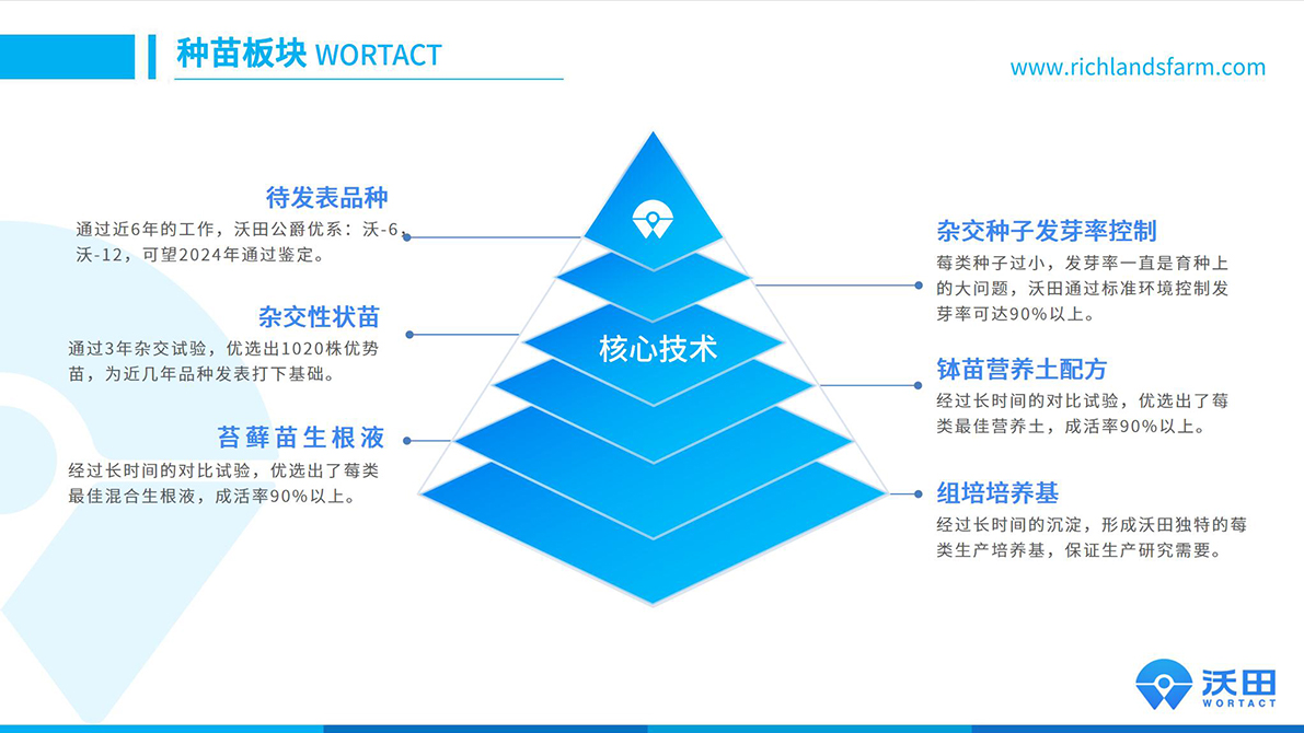 沃田研發中心坐落于贛榆區特色水果產業園區示范園內,是政企聯合運營的典范。研發中心建有2000平方米的組培車間,200平方米配套化驗室,3200平方米育苗轉換棚,3200平方米溫室及500畝育苗基地,年組培育苗能力1000萬株。經過沃田科研團隊多年來對全球眾多藍莓品系的栽培比較實驗,沃田目前擁有公爵、藍豐、布里吉塔、雷格西等全球公認優質藍莓品種及國際專利品種,為全國種植企業及農戶提供優質藍莓苗木。